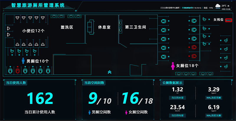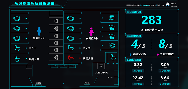 可以通過公廁外墻上的電子顯示屏,清晰的了解男、女廁和第三廁位分布情況,紅色亮起表示這個(gè)公廁目前有人使用。綠燈表示公廁空閑。通過這種直觀的方式就可以了解、判斷哪個(gè)廁位可用。公廁每個(gè)蹲位都安裝提供一鍵緊急呼叫按鈕,使用者按下呼叫鈴,工作人員將趕到廁所提供幫助。公廁門口架設(shè)蹲位顯示器,界面化的顯示廁所實(shí)際情況,同時(shí)還可以可投放第三方廣告商,第三方自動(dòng)售貨機(jī)。