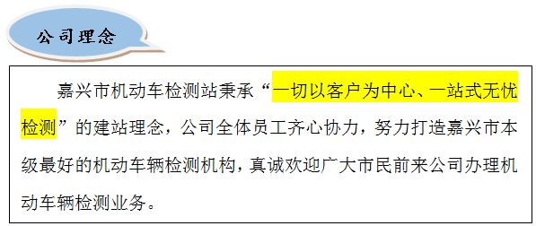 嘉興市機(jī)動車檢測站有限公司 檢測時間:周一至周五8:30~16:00(周六8:30~15:00只檢驗(yàn)小型微型非營運(yùn)客車)