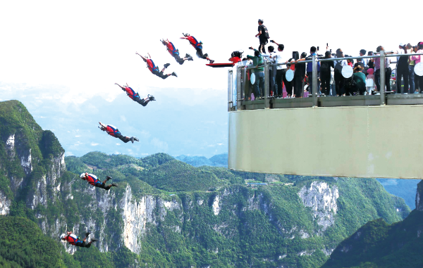 △ 2018年4月27日,中國(重慶·云陽)第二屆世界低空跳傘大賽在重慶云陽龍缸景區(qū)舉行,來自美國、加拿大、澳大利亞、委內(nèi)瑞拉、智利等國家的16位世界頂級(jí)低空跳傘選手,以極其精湛的低空跳傘技藝挑戰(zhàn)世界第一懸挑玻璃廊橋——云端廊橋。劉興敏攝