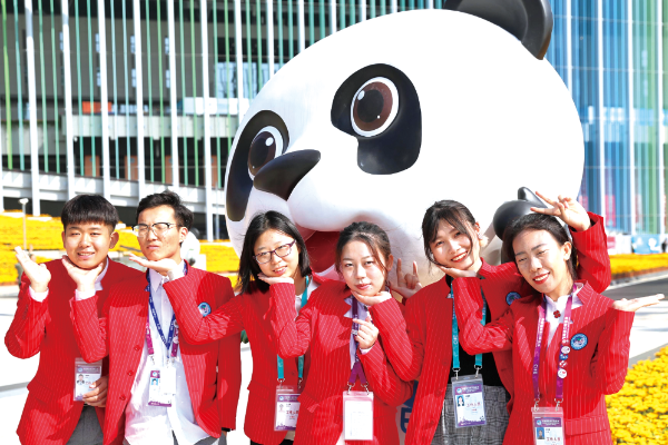 △ 2018年11月10日,首屆中國國際進(jìn)口博覽會(huì)完滿閉幕。進(jìn)博會(huì)志愿者“小葉子”在國家會(huì)展中心(上海)合影留念。張亨偉攝