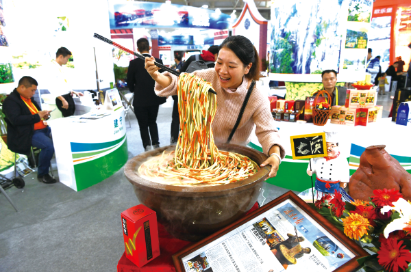 △ 2018年11月30日,第四屆“海上絲綢之路”(福州)國際旅游節(jié)在福州海峽國際會(huì)展中心開幕,參觀者被福建尤溪大條面模型吸引。王東明攝