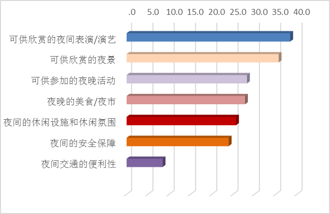 專項(xiàng)調(diào)查數(shù)據(jù)顯示,游客對(duì)景色、活動(dòng)、餐飲、休閑等夜游要素的訴求相對(duì)均衡,35.7%的受訪者人群關(guān)注可供欣賞的美景,夜晚活動(dòng)、休閑氛圍、安全保障、美食/夜市的訴求比重在23%-28%之間。如今愈發(fā)多元的夜間消費(fèi)場(chǎng)景為城市的夜晚注入了活力。游客希望在有限的時(shí)間內(nèi)體驗(yàn)更多活動(dòng),享受更多的服務(wù),夜游產(chǎn)品的豐富程度和品質(zhì)需求并重。