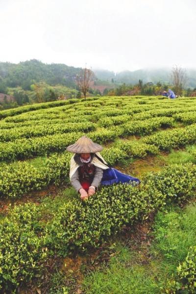 盧峰茶葉基地的茶農(nóng)冒雨趕在清明節(jié)前采摘茶葉。