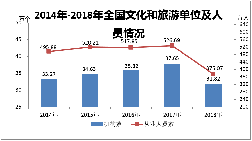 2018年末,納入統(tǒng)計(jì)范圍的全國(guó)各類文化和旅游單位31.82萬(wàn)個(gè),從業(yè)人員375.07萬(wàn)人。其中,各級(jí)文化和旅游部門所屬單位66835個(gè),增加91個(gè);從業(yè)人員67.06萬(wàn)人,增加0.34萬(wàn)人。