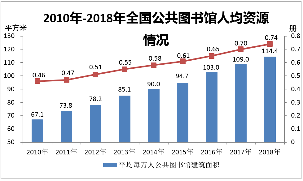 年末全國(guó)平均每萬(wàn)人公共圖書館建筑面積114.4平方米,比上年末增加5.4平方米;全國(guó)人均圖書藏量0.74冊(cè),比上年末增加0.04冊(cè);全年全國(guó)人均購(gòu)書費(fèi)1.77元,比上年末增加0.07元。