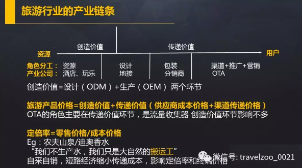 我們今天看到的旅游供應商、資源商其實是在創(chuàng)造價值環(huán)節(jié),而OTA、線下門店、旅游分銷商、對產品的推廣、宣傳都是在傳遞價值環(huán)節(jié)。