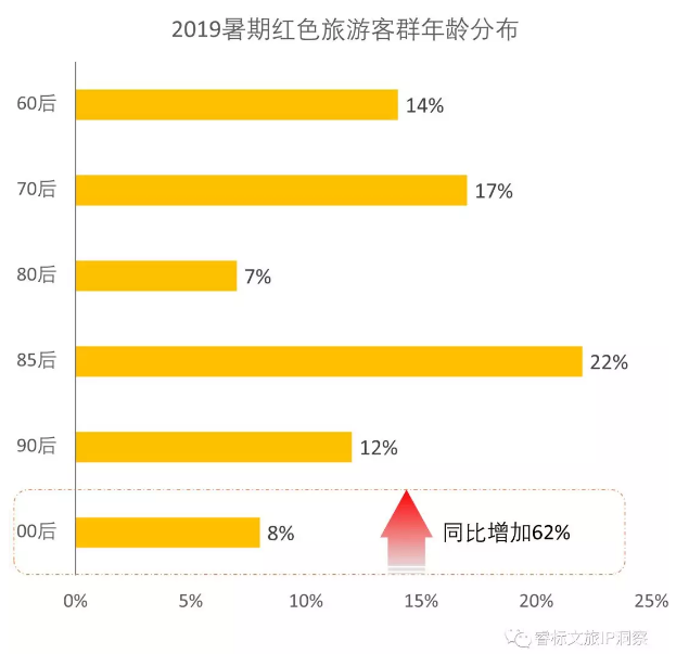 從出游群體來看,年輕化逐漸成為紅色旅游的新趨勢。85后以22%的占比,成為紅色旅游市場的主力人群,70后緊隨其后,00后占比同比增幅達(dá)62%。