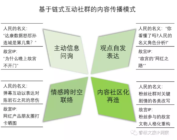 和故宮超級(jí)IP一樣的是,《人民的名義》雖然與特定地點(diǎn)無關(guān),但都成功構(gòu)建了基于鏈?zhǔn)交?dòng)社群的內(nèi)容傳播模式。主動(dòng)信息問詢、觀點(diǎn)自發(fā)表達(dá)、情感跨時(shí)空聯(lián)絡(luò)和內(nèi)容社區(qū)化再造等等消費(fèi)者行為,使得受眾認(rèn)知突破嚴(yán)肅場景,為超級(jí)IP的轉(zhuǎn)型與構(gòu)建提供了強(qiáng)大流量。
