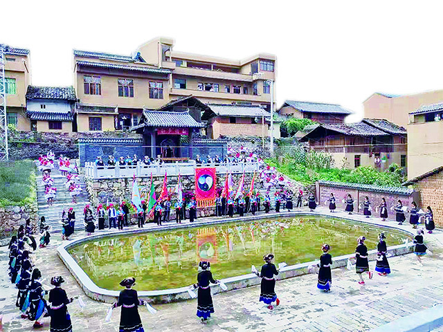 王秉福考取進(jìn)士時的答卷,他闡明“乃合天下之大,而業(yè)足以蓋之。極萬世之遙,而德足以垂之”的觀點,演藝廳中有一副“三鳥共一嘴圖”,寓意人要尊重自然、保護(hù)萬物、和諧共處,現(xiàn)今,這幅圖有了新的寓意:各民族要始終“同呼吸、共命運、心連心”,形同三鳥共一嘴,共同團結(jié)奮斗、共同繁榮發(fā)展。設(shè)立于村子中央的村訓(xùn)墻,寫著“勤德善仁”的村訓(xùn),時刻激勵和鞭策村民們知禮明德,寬厚仁愛,踐行守望相助理念。在神蛙廣場,每逢節(jié)日,各族群眾在這里載歌載舞,共度佳節(jié),這里儼然成了各民族交往交流交融的大舞臺。從馬灑的一圖一畫、一磚一木、一屋一景中可以看出,中華民族共同體意識早已融入馬灑人民心中,代代相傳。