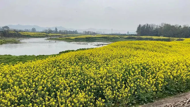 吸引游客的這片金黃燦爛的油菜花田,地處蒲江河下游,地勢(shì)相對(duì)低洼,汛期易淹易澇,多年來(lái),周邊村民房屋、糧田數(shù)次遭受洪澇傷害,影響了村莊周邊環(huán)境以及旅游項(xiàng)目開(kāi)發(fā)進(jìn)度。誰(shuí)能想到,這片原來(lái)沒(méi)辦法產(chǎn)生規(guī)模性收益的土地,如今正打造萬(wàn)畝糧經(jīng)復(fù)合種植基地,田里套種了橙色、粉色、紫色等多彩油菜進(jìn)行圖形組合,形成一道頗具特色的大地景觀,雜亂無(wú)序的“小田”變?yōu)檎R劃一的的“大田”。千畝油菜花正在爛漫盛開(kāi),沿蒲江河兩岸,花海成群,閃耀著洋洋灑灑的一片金色,目光所到之處,到處是花的海洋。