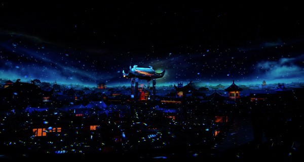 幻城以黃河文明為根基,通過棋盤式布局的56個(gè)格子院落,構(gòu)建了一座“可進(jìn)入的史詩”。核心區(qū)單邊長328米、高15米的夯土城墻,既是物理屏障,也是文化符號——墻面鐫刻的隸書文字訴說著土地、糧食與傳承的主題,而夜晚328米的動(dòng)態(tài)投影《清明上河圖》《千里江山圖》則將歷史畫卷與現(xiàn)代科技無縫鏈接。21個(gè)劇場、近千名演員、總時(shí)長700分鐘的劇目,以夏商至當(dāng)代的時(shí)間軸串聯(lián),從《天子駕六遺址坑》的禮樂重現(xiàn)到《李家村劇場》1942年饑荒的集體記憶,構(gòu)建起中原文明的立體敘事網(wǎng)絡(luò)。