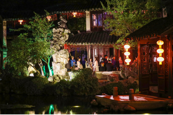 暮色漸濃,退思園內(nèi)投影的明月悄然爬上粉墻,幾位銀發(fā)游客在導(dǎo)游陪同下緩步其間。園外水道中,最后幾艘夜游船正載著游客穿過(guò)橋洞,船槳?jiǎng)澠频褂持鵁艋\光影的水面。