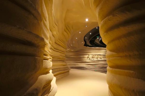 建筑外墻同樣蘊(yùn)含深意:夯土材質(zhì)模擬黃河泥沙沉積效果,分層勾勒的線條復(fù)刻仰韶時期原始肌理,內(nèi)嵌貝殼碎片則傳遞著先民生活的原始脈動。入口處的黃河文化主題墻,更以九種地貌色調(diào)再現(xiàn)黃河“九曲回環(huán)”之勢。