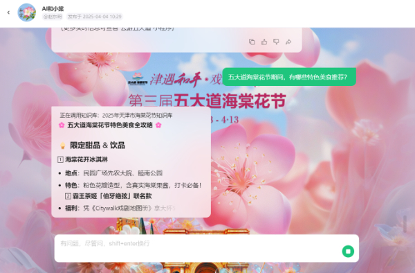 “2025海棠花節(jié)亮點(diǎn)有哪些?”游客對(duì)著手機(jī)提問(wèn),屏幕上甜美的虛擬形象“和小棠”即刻響應(yīng):“本屆海棠花節(jié)包含177場(chǎng)文化演藝活動(dòng),覆蓋睦南公園沉浸式電競(jìng)展演、金街非遺市集等...”這位虛擬導(dǎo)游裝載了和平區(qū)文旅局授權(quán)的200余條專業(yè)知識(shí),以DeepSeek大模型為技術(shù)底座,構(gòu)建了強(qiáng)大的文旅知識(shí)庫(kù)。
