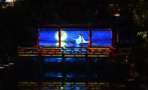 沿著青石板路前行,九曲橋畔的激光霧森中流轉(zhuǎn)著《百妖譜》的百夭桃樹與《霧山五行》的潑墨山水,一步一景皆成東方幻想的具象化表達(dá)。在舊校場路——明代駐兵演武場的舊址,《鎮(zhèn)魂街》中“這條街我說了算”的熱血宣言在聲光技術(shù)中回蕩,喚醒沉睡的歷史基因。而在竹園深處,《靈籠》的未來科幻感與江南園林的飛檐翹角碰撞,生出奇妙的時(shí)空褶皺。