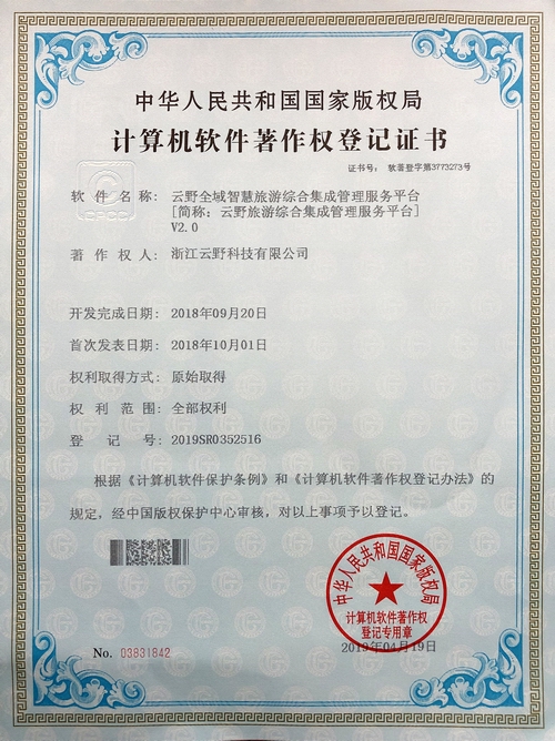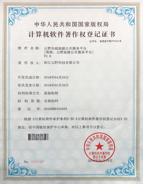 《云野全域智慧旅游綜合集成管理服務(wù)平臺(tái)V2.0》于2019年4月19日被正式授予《中華人民共和國國家版權(quán)局計(jì)算機(jī)軟件著作權(quán)登記證書》,登記號(hào)為2019SR0352516。