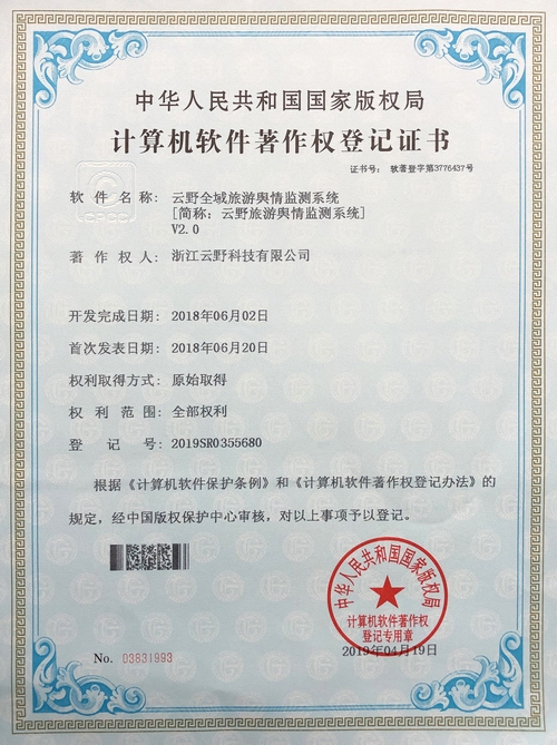 《云野全域旅游輿情監(jiān)測系統(tǒng)V2.0》于2019年4月19日被正式授予《中華人民共和國國家版權(quán)局計(jì)算機(jī)軟件著作權(quán)登記證書》,登記號(hào)為2019SR0355680。