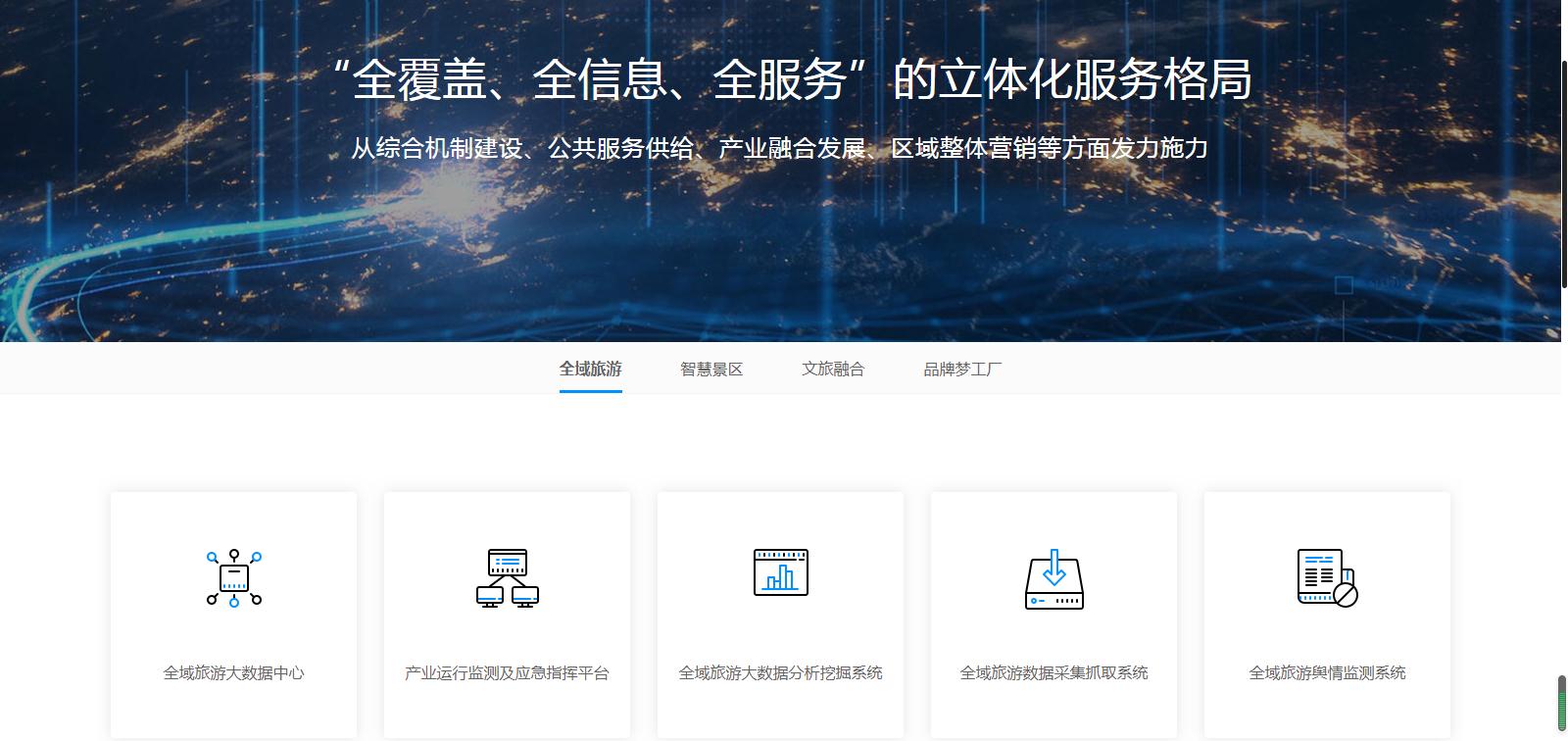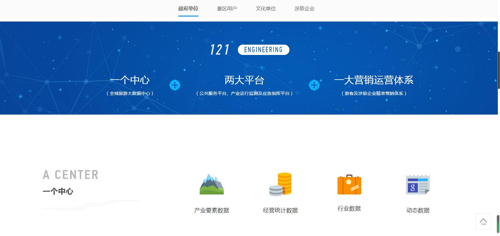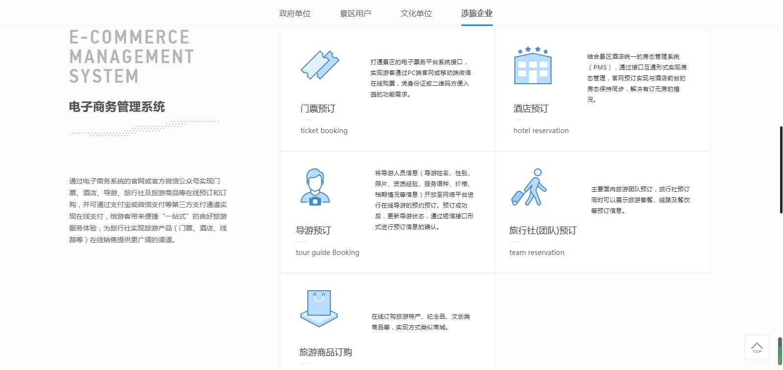 針對不同用戶屬性,分為政府單位、景區(qū)用戶、文化單位、涉旅企業(yè)。為不同行業(yè)客戶及合作伙伴,提供更為詳盡的方案支持,如政府單位的全域旅游“121工程”、景區(qū)用戶的“1234 M”技術(shù)、文化單位的服務(wù)平臺(tái)建設(shè)體系、涉旅企業(yè)的電子商務(wù)系統(tǒng)和活動(dòng)營銷平臺(tái)。